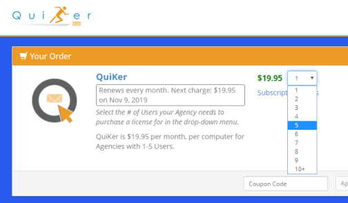 You can add Users at any time! Users can be deactivatedor canceled with 30-days' notice. To purchase, determine the number of QuiKer Users who will be activated under your Agency's permanent License Key, and click "SELECT" in the box that corresponds to the number range of QuiKer Users you will have in your Agency.